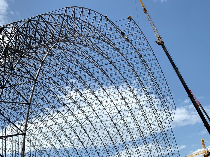 (2)网架加工前应对现场尺寸进行复测,确认无误后方可进行加工、安装;网架制作、运输、安装应遵守《空间网格结构技术规程》JGJ7-2010、《钢网架江门螺栓球节点》JG/T 10-2009、《钢网架江门螺栓球节点用高强度螺栓》 GB/T 16939-2016、《江门钢结构江门工程江门施工规范》 GB50755-2012、《江门钢结构江门工程施工质量验收标准》 GB50205-2020。